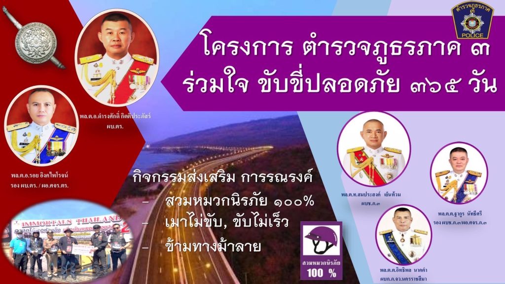 ร่วมจัดกิจกรรม โครงการตำรวจภูธรภาค 3 ร่วมใจ ขับขี่ปลอดภัย 365 วัน ร่วมส่งเสริม รณรงค์ ในการขับขี่รถจักรยานยนต์จะต้องสวมหมวกนิรภัย 100% เมาไม่ขับ ขับไม่เร็ว และ ข้ามถนนตรงทางม้าลาย เพื่อขับเคลื่อนดำเนินการในการป้องกันและลดอุบัติเหตุทางถนน ลดอัตราการเกิดอุบัติเหตุ การบาดเจ็บ และการเสียชีวิต ของผู้ใช้รถใช้ถนนในพื้นที่รับผิดชอบของตำรวจภูธรภาค 3 ตามนโยบายของ พล.ต.อ.ดำรงศักดิ์ กิตติประภัสร์ ผู้บัญชาการตำรวจแห่งชาติ , พล.ต.อ.รอย อิงคไพโรจน์ รองผู้บัญชาการตำรวจแห่งชาติ/ผู้อำนวยการศูนย์บริหารงานจราจรสำนักงานตำรวจแห่งชาติ , พล.ต.ท.ธนา ชูวงศ์ ผู้ช่วยผู้บัญชาการตำรวจแห่งชาติ/รองผู้อำนวยการศูนย์บริหารงานจราจรสำนักงานตำรวจแห่งชาติ ซึ่งได้สั่งการให้หน่วยในสังกัด ให้ความสำคัญกับการแก้ไขปัญหาการจราจรในทุกพื้นที่ ปฏิบัติการเชิงรุก แสวงหาความร่วมมือจากหน่วยงานภาคีเครือข่ายร่วมปฏิบัติ และความร่วมมือจากประชาชนในทุกพื้นที่ ได้ปฏิบัติตามกฎหมายและกฎจราจรโดยเคร่งครัด